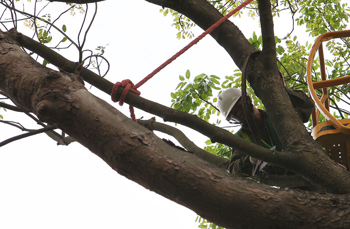 Tiến hành buộc dây vào cành cây và cưa cây trên cao